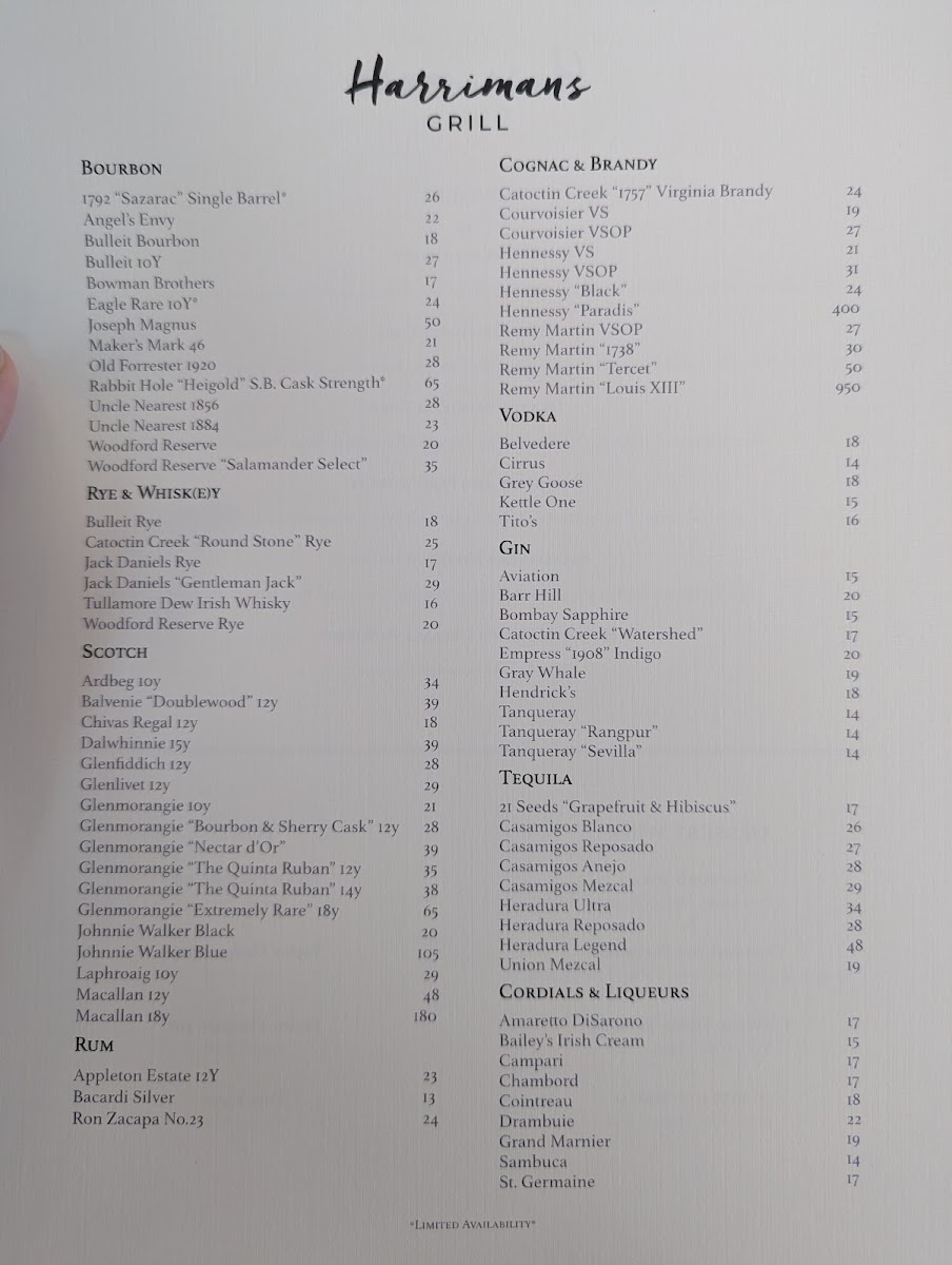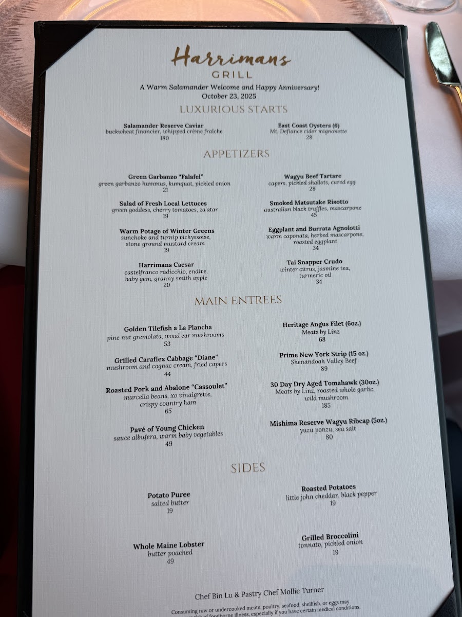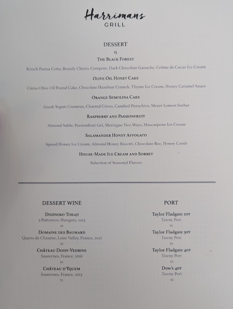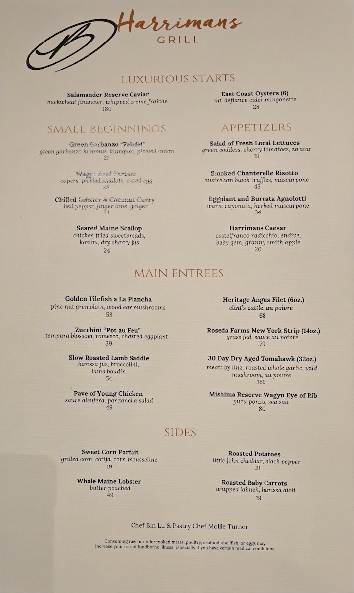From a reviewer’s perspective, the menu at Harrimans Grill feels refined and thoughtfully curated, beginning with the luxurious starters like Salamander Reserve Caviar and East Coast Oysters (6), which set an elegant tone right away. The appetizers continue that impression with creative and high-quality selections such as Green Garbanzo "Falafel", Wagyu Beef Tartare, Salad of Fresh Local Lettuces, Smoked Chanterelle Risotto, and Warm Potage of Winter Greens, each dish sounding seasonal, well-sourced, and carefully prepared. Overall, the menu reads as upscale yet grounded in fresh ingredients and classic techniques, offering a balanced variety of light starters and rich, comforting dishes that would appeal to diners looking for a fine dining experience with a strong focus on flavor and presentation.