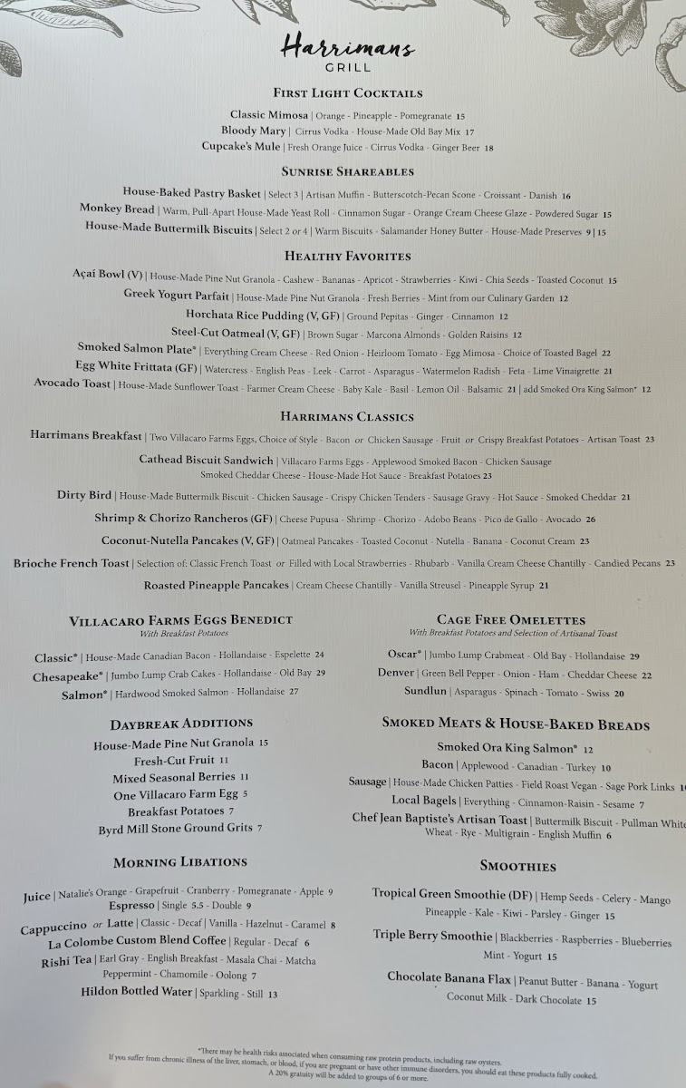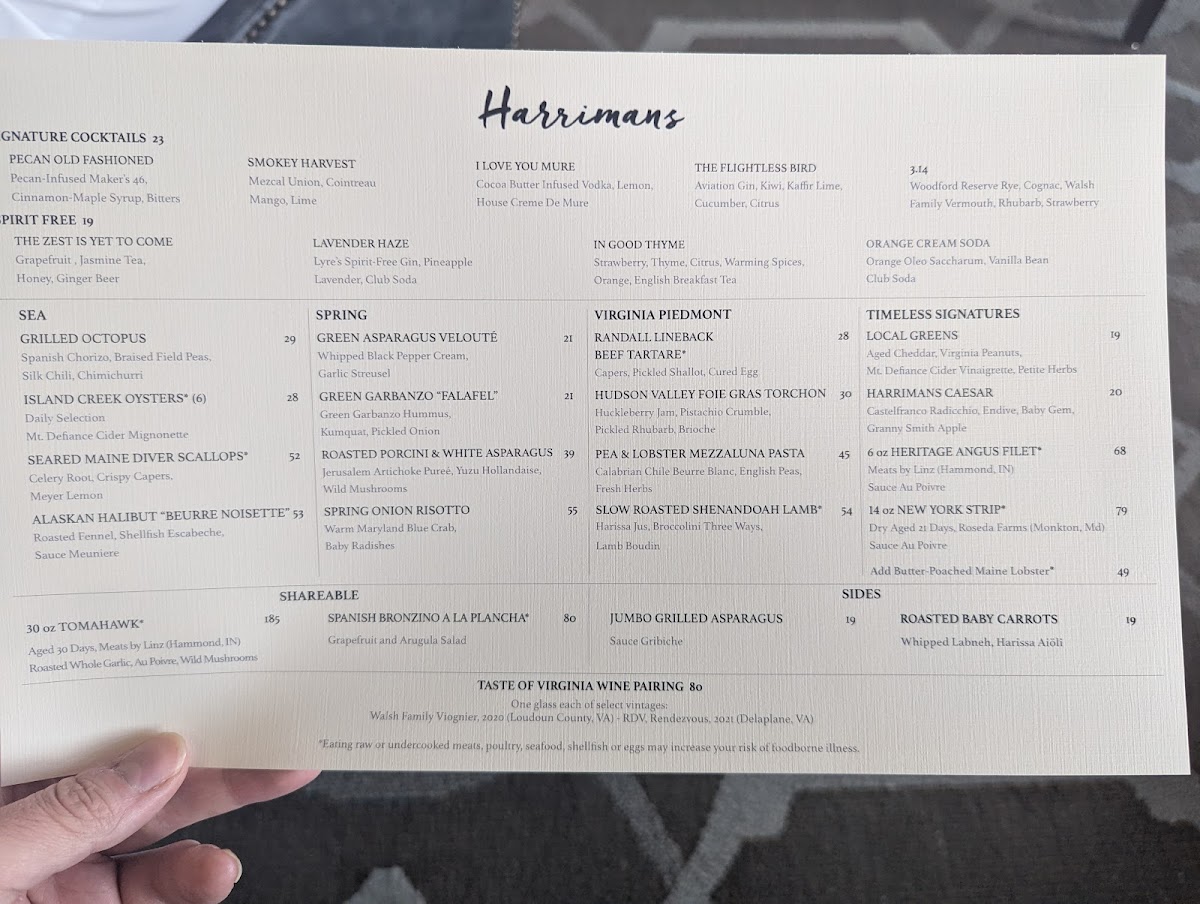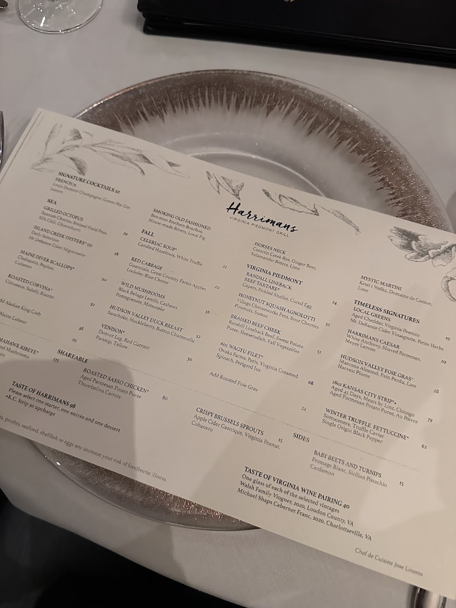 From a reviewer’s perspective, the menu at Harrimans Grill feels refined and thoughtfully curated, beginning with the luxurious starters like Salamander Reserve Caviar and East Coast Oysters (6), which set an elegant tone right away. The appetizers continue that impression with creative and high-quality selections such as Green Garbanzo "Falafel", Wagyu Beef Tartare, Salad of Fresh Local Lettuces, Smoked Chanterelle Risotto, and Warm Potage of Winter Greens, each dish sounding seasonal, well-sourced, and carefully prepared. Overall, the menu reads as upscale yet grounded in fresh ingredients and classic techniques, offering a balanced variety of light starters and rich, comforting dishes that would appeal to diners looking for a fine dining experience with a strong focus on flavor and presentation.